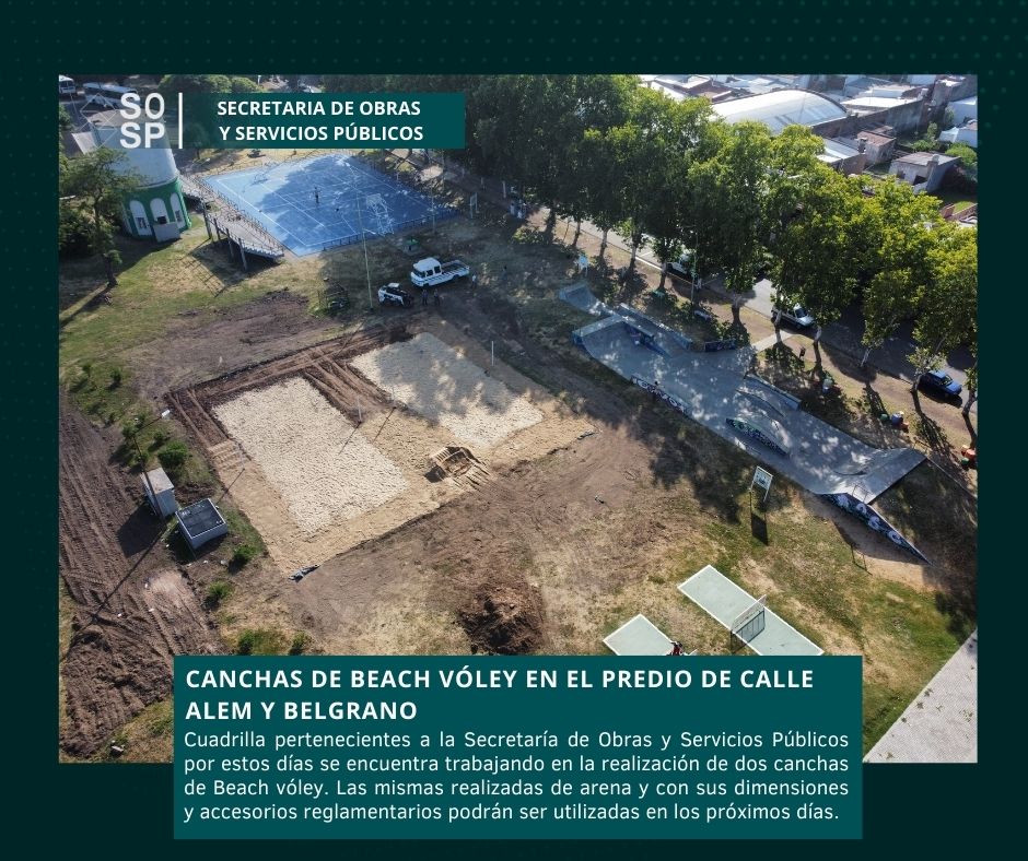 Cuadrilla pertenecientes a la Secretaría de Obras y Servicios Públicos por estos días se encuentra trabajando en la realización de dos canchas de Beach vóley. Las mismas realizadas de arena y con sus dimensiones y accesorios reglamentarios podrán ser utilizadas en los próximos días.