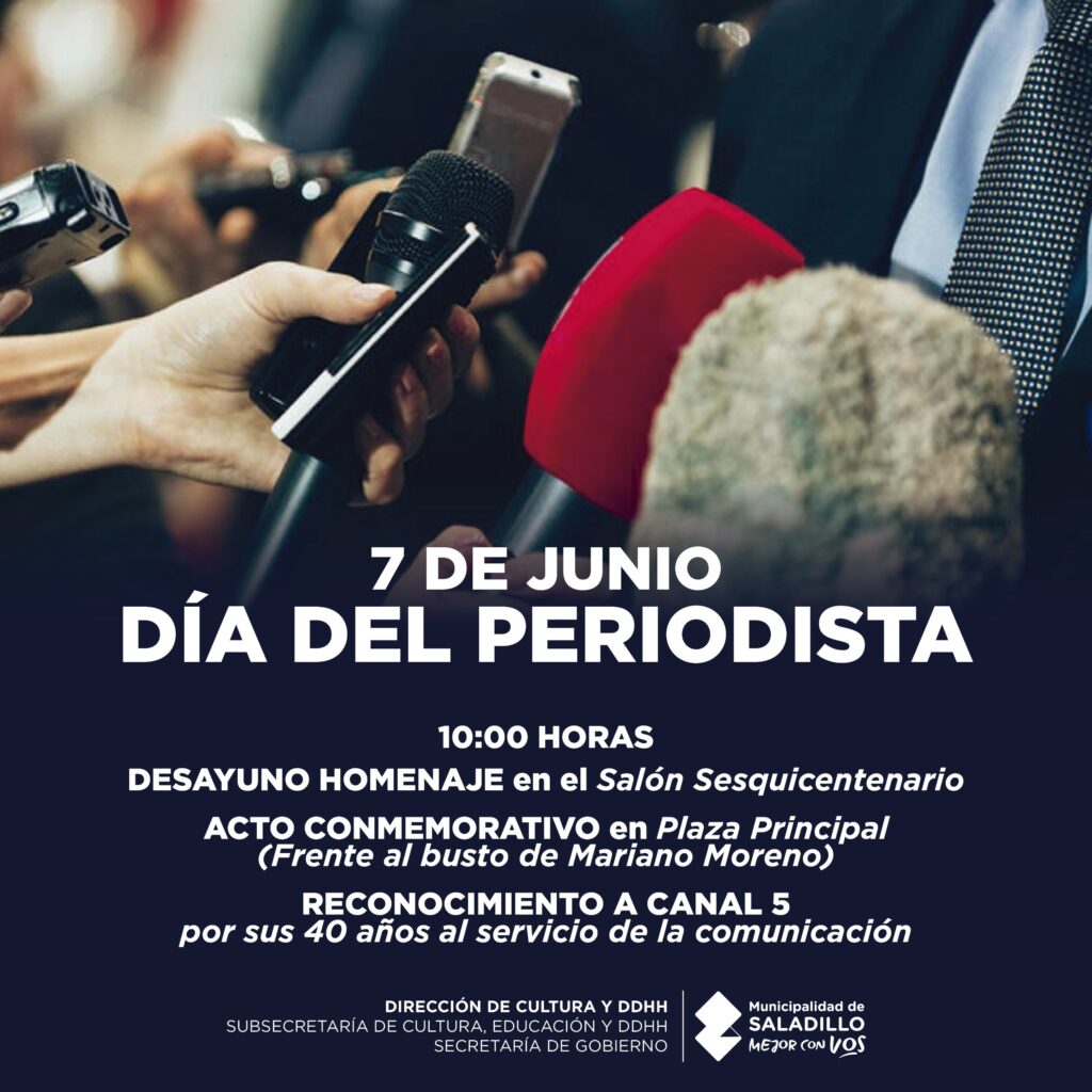 7 de junio | Día del Periodista.-Por admin / 4 junio, 2025 Compartir en 10:00 HORAS DESAYUNO HOMENAJEen el Salón Sesquicentenario ACTO CONMEMORATIVOen Plaza Principal(Frente al busto de Mariano Moreno) RECONOCIMIENTO A CANAL 5por sus 40 años al servicio de la comunicación Compartir en