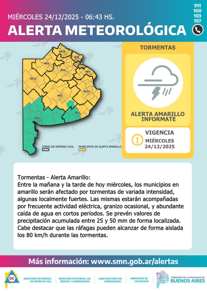 Se estima que algunas tormentas puedan alcanzar intensidad localmente fuerte sobre el centro, norte y noroeste provincial (extremo norte de la zona DC 6 y zonas DC 3, 4, 5 y 11) entre la mañana y la tarde. Posteriormente, durante la tarde, los fenómenos podrían extenderse al resto del área en alerta (zonas DC 1, 2, 7, 8, 9, 10 y 12, incluyendo el AMBA).