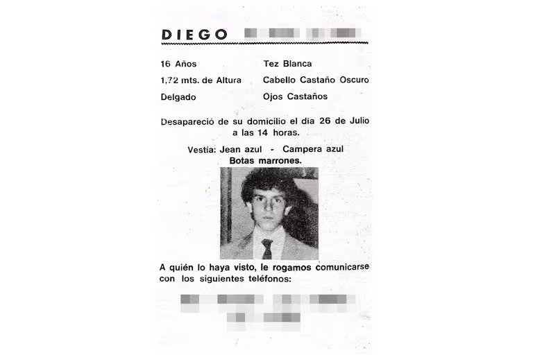 A partir del momento de la desaparición de Diego y sin la colaboración policial, la familia inició una intensa búsqueda. Repartió volantes, contactó medios y logró solo una entrevista en la revista ¡Esto!, publicada por Crónica, en mayo de 1986. Allí, Juan, el padre del joven desaparecido expresó su impotencia: “La Policía dice que tiene tres mil casos iguales… Desde el primer momento lo caratularon como ‘fuga de hogar’. Me negué a eso, pero como si nada. ¿Qué quieren investigar si ya dan por sentado que se fue?”