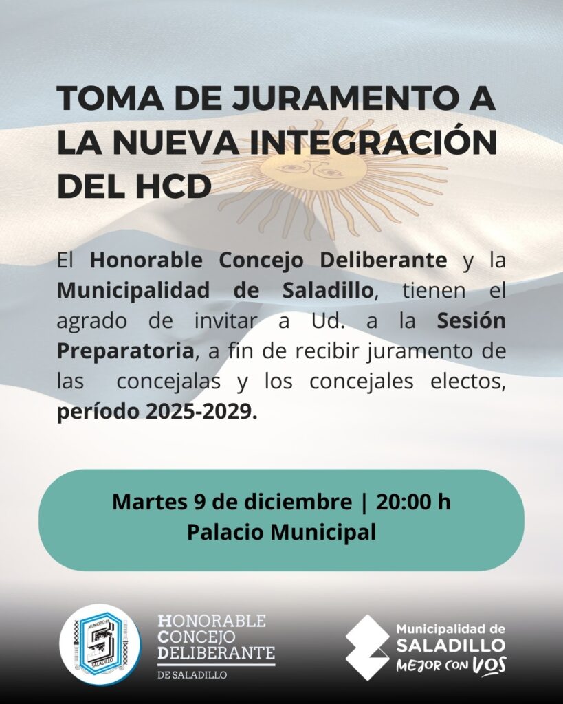 El Honorable Concejo Deliberante y la Municipalidad de Saladillo informan a la comunidad que el próximo martes 9 de diciembre, a las 20:00 hs, se llevará a cabo la Sesión Preparatoria en el Palacio Municipal.
