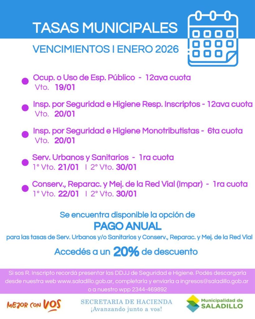 La Oficina de Ingresos Públicos comunica que por cuestiones técnicas del sistema por cambio de año, el vencimiento de la cuota 1 de la tasa por Servicios Urbanos y Sanitarios, es el día 21 de enero.